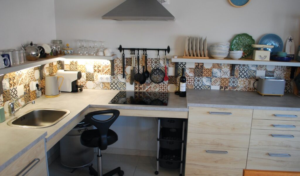 A fully adapted kitchen with lowered counters and accessible storage